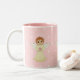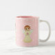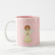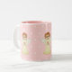 Uma linda caneca com três pequenos anjos com padrão de estrela em fundo rosa.