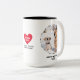 Uma bela caneca de memória para um querido animal de estimação com duas fotos personalizadas, nome e datas de nascimento/morte. Há um coração vermelho no meio da caneca com a frase "In Loving Memory" (editável) junto com a área abaixo para texto personalizado.