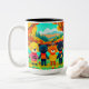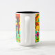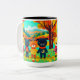 Fall Pooches Café Mug vem em cores brilhantes de outono com 4 pooches adoráveis e uma coruja amigável. As cores são canela, cinza escura, amarelo, azul e verde.