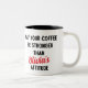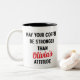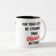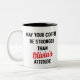 Mostre seu apreço pelo pai com esta caneca de café engraçada e personalizada. Presente ideal para pai da filha. Personalize a caneca para o dia de os pais. O texto diz: "Meu café é mais forte que a atitude do NOME PERSONALIZADO" personalizado com o nome das filhas. Apresenta texto em negrito em script preto e vermelho. A fonte e a cor do script podem ser alteradas. A caneca também funciona bem para o aniversário do Pai e o Natal. Design é impresso em ambos os lados da caneca
