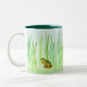 Esta caneca caracteriza sapos verdes fêmeas pequenos com as barrigas amarelas que sentam-se entre as gramas na lagoa. Parecem sós como se esperando o príncipe encantar para aparecer.