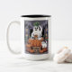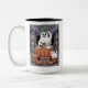 Pumpkins For Sale & Caffeine Ghost & Cat V2 Two-Tone Coffee Mug. A white sheet ghost lounges on a giant pumpkin, pumpkin leaf hat flopping in the rain, sipping coffee like a spooky barista. Beside a “Pumpkins for Sale” sign, Mr Cat wearing a witch hat, plots world domination. Halloween hustle? More like haunted hangout.