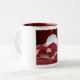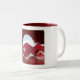design de paisagem abstrato em vários tons de vermelho com um luar, colinas, árvores, nuvens e aves.