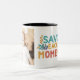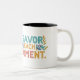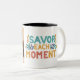 Salva cada momento Mug de Café de Dois Tom Um design tipográfico colorido com a citação motivacional "SAVOR CADA MOMENTO" cercado por elementos decorativos tipo folha em um fundo escuro. O uso de cores vibrantes e embelezamentos artísticos torna esta imagem visualmente atraente e inspiradora.