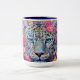 Linda leopardo-da-neve com flores ao redor, caneca de café.