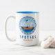 Spetses, Grécia caneca de duas cores com um desenho de um navio grego antigo e letras em estilo grego. Este desenho de navio da Grécia Antiga tem a chave grega em um desenho de círculo com o mar e o céu. Este desenho em estilo grego torna esta caneca um presente ideal ou lembrança ou para beber café enquanto você está de férias em Spetses.