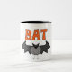 Um morcego preto do Halloween e um texto laranja que diz "BAT" em t-shirts de morcegos, fatos, canecas, cartões, autocolantes, sacos de tote, botões, ímãs e outras t-shirts e presentes MTD do Halloween.
