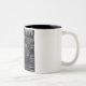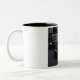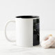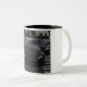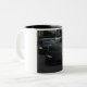 Uma caneca de cerâmica branca com jante preta. A design da caneca apresenta uma imagem monocromática de dois carros de luxo pretos em uma rua da cidade. O primeiro plano mostra a extremidade frontal de um Lamborghini, com seus faróis distintos claramente visíveis. Por trás do Lamborghini, uma BMW é parcialmente visível. O fundo inclui uma paisagem urbana turva, com elementos de prédios e possivelmente árvores. A imagem inteira é predominantemente sombra escura de cinzas e preta. A caneca é posicionada sobre uma superfície de cor clara, provavelmente mármore ou um material semelhante, com uma luz macia refletindo na sua superfície.