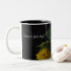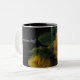 Girassóis e folha verde. Fundo preto. "Tenha texto de um grande dia" no lado da caneca.