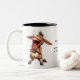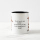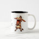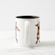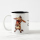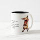 Uma caneca de café de duas cores com uma inscrição e gráficos divertidos.