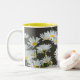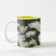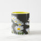 Uma caneca decorativa moderna com margaridas ensolaradas sobre fundo de cinza escura.