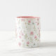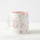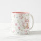 Whimsical Bunny Teapot Floral Spring Two-Tone Coffee Mug. This design features a delightful whimsical bunny nestled within a pink teapot, surrounded by spring blossoms and green foliage. This floral pattern brings a touch of spring magic to your everyday sips. Perfect for tea, coffee, or hot cocoa, it makes a delightful gift for Easter, Mother's Day, birthdays, or any occasion for a bunny lover.