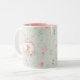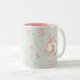 Whimsical Bunny Teapot Floral Spring Two-Tone Coffee Mug. This design features a delightful whimsical bunny nestled within a pink teapot, surrounded by spring blossoms and green foliage. This floral pattern brings a touch of spring magic to your everyday sips. Perfect for tea, coffee, or hot cocoa, it makes a delightful gift for Easter, Mother's Day, birthdays, or any occasion for a bunny lover.