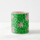 Mug em um padrão de flores de chupa de mel William Morris Art Nouveau contra fundo de vinha e folhas - flores em tons de gelo cor-de-rosa, com folhas verdes esmeraldas, contra um fundo verde pastoso