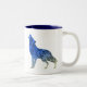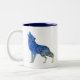 Esta design é o contorno de um lobo uivante com um gradiente de cor azul a bege e a silhueta de um dentro de árvore.