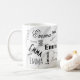 Introducing a unique typography custom name mug that highlights "Emma" in diverse type styles. The initial script is prominently displayed in the background, adding depth to the design. With contrasting colors of black, white, and grey, this coffee cup stands out. It’s unmistakably yours, thanks to the personalized name emblazoned on it.