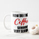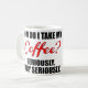 Caneca de café bonito que diz "como I toma meu café seriamente muito seriamente" no texto preto e vermelho.
