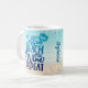 Esta caneca de café de verão divertida mostra a imagem de texto "Repetição do Vinho de Praia do Café" em azul-ombre no fundo da aquarela da praia. Adicione o seu nome ao longo do lado para personalizar ou apague o nome para uma aparência limpa.