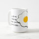 Mug com uma foto de um ovo e as palavras, "Um verdadeiro amigo acha que você é um bom ovo mesmo que você esteja meio rachado."