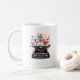 Perfeito para aquelas sessões noturnas. Não necessariamente para café também! Uma máquina de escrever colorida de um lado e as palavras "Escritor no Trabalho? do outro.