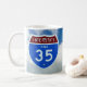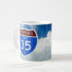 Fotografia de um escudo interestadual 35 contra fundo de um céu azul com nuvens brancas puffy impressas em ambos os lados da caneca. Shield Image copyright 2013 de Margaret E. Cmelik.