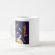 uma caneca personalizada com fundo azul escuro com estrelas amarelas espalhadas ao redor. Camadas sobre o topo é uma ilustração de um homem espacial vestindo um traje astronauta branco flutuando sobre a lua. Ao longe está um planeta com anéis e um foguete voando para o céu procurando novos mundos para explorar.