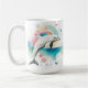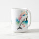 Uma vibrante obra geométrica e de aquarela apresentando um golfinho saltando graciosamente do oceano. A composição combina padrões poligonais com um espectro de traços coloridos de aquarela, incluindo um pano de fundo impressionante do arco-íris. Formas geométricas como círculos, triângulos e linhas de abstrato estão entrelaçadas, simbolizando a conexão entre natureza e arte. Esta design exude energia, alegria e harmonia, celebrando o espírito lúdico do oceano.