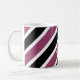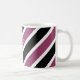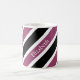 Esta caneca apresenta um padrão diagonal listrado em branco, preto e roxo. Personalize-o com o seu nome em letra branca colocada na diagonal sobre a faixa roxa.