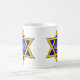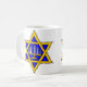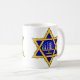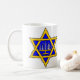 Estrela Amarela de David preenchida com azul e uma menorá.