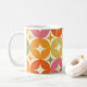 Este é o estrelo clássico de meio século sobre o padrão de círculos coloridos geométricos em vermelho, laranja, verde-oliva, amarelo e rosa. É uma caneca excelente para qualquer um que retro designs geométricos