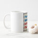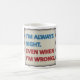 Caneca que caracteriza o design com o texto "eu sou sempre direito. Mesmo quando eu sou errado" em azul e em vermelho.