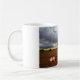 Brinquedo solitário (avião) num campo deserto de terra vermelha através de uma vasta paisagem intacta sob céus tempestuosos. À distância, o sol está se quebrando através das nuvens de tempestade.