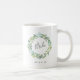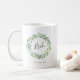 Uma doce e elegante marca de casamento, a caneca apresenta uma camada aquosa de folhas verdes de eucalipto sábio e folhagem com "noiva" inscrita em dentro com escrita escrita à mão. Personalize com sua data de casamento embaixo. Projetado para combinar com a nossa coleção floral de MidSummer.