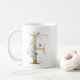 Letra F, inicial dourada, com folhagem azul de cor aquosa, caneca inicial. © Julie McIver
