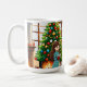 Esta é uma caneca de café festiva da Habatour Creations original, decorada com um design de ilustração artística, apresentando uma família em volta da lareira no Natal com um direito autoral decorado da árvore de Natal por @Habatour Creations Copiar ou usar sem permissão é ilegal
