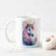 Mug com dois monocórnios majestosos em meio a um fundo sonhador de cores pastéis macios com um homem fluente adornado com flores delicadas, criando uma cena encantadora.