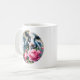 This ceramic coffee mug is shown with a cute farm cow art print.