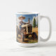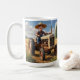 Esta caneca de café divertida apresenta um fazendeiro de desenho animado em um trator. Excelente para aquele homem que ama seus brinquedos!