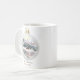 A caneca de presente de Natal decorada com um ornamento bauble de Natal com uma foto de vintage de uma cabana de madeira antiga sentada à beira de uma montanha coberta de neve. A neve está caindo por toda parte. Personalizado com o texto personalizado "Feliz Natal do Seu Nome ou Nome da Família". Essas canecas são presentes perfeitos quando com embalagens de cacau quente ou outros presentes pequenos, e amarradas com um arco.