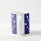 Feliz Natal Blue Coffee Mug com fundo azul e flocos de neve brancos.