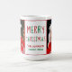 Esta linda e moderna caneca de Natal Feliz apresenta 2 fotos da família em um fundo branco com tipografia bonito vermelha e verde personalizada. Este belo presente de fotos de crianças personalizadas apresenta as fotografias do seu próprio filho em ambos os lados da sua mensagem festiva e o nome da sua família em verde.
