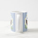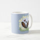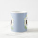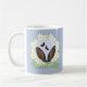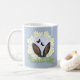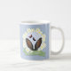 Esta caneca de felz pascoa apresenta uma bonito camada de felz pascoa de margaridas florais com orelhas de coelho de cinza e borboletas em um fundo azul.