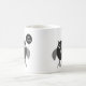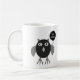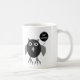 Esta caneca na moda apresenta uma coruja assustadora com grandes olhos assustadores e garras afiadas. Seu corpo é preto e suas asas, orelhas, garras e bico são cinzas. A coruja está segurando um balão com "Feliz Halloween" escrito sobre ele e pronto para festas.