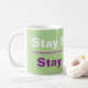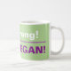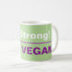 Uma caneca verde com o slogan 'Fique forte! Fique VEGAN! Excelente caneca para dar como presente ao seu amigo vegano ou para guardar por si mesmo. O texto é branco e roxo. Todo texto é modelo e pode ser facilmente editado para uma mensagem de sua própria escolha.