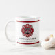 This elegant Firefighter Red Maltese Cross Fire Department Two-Tone Coffee Mug is customisable with Name and Station or Rank. Add personalized name and station to make it truly unique. This mug features a maltese cross with ladder and fire hydrant icon, along with FIRE DEPARTMENT on top and bottom with thin red line on top and bottom of mug, with a firetruck on black circle. Perfect for gift ideas and everyday use.