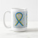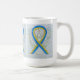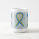 A caneca do anjo da guarda apresenta a pintura de um anjo de fita de reconhecimento azul e amarelo. Fita de sensibilização azul e amarela significa apoio a crianças com Síndrome de Down. Os copos ou canecas de fita ou canecas com anjo de consciência azul e amarelo podem ser personalizados com mensagens personalizadas para fazer canecas com excelente para arrecadação de fundos, presentes no copo de consciência ou outros eventos ou ocasiões especiais.