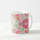 Uma caneca floral rosa e verde com flores de maçã. Personalize este primavera floral doce, adicionando seu nome e monograma iniciais ao crachá cor-de-rosa profundo de octogão. Esta é parte da Coleção de Monogramas de Rosa de Raptura Floral do Flor da Maçã.