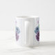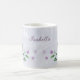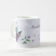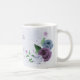 Linda caneca de café romântica com flores roxas e azuis empoeiradas e algumas folhas verdes .