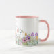Esta caneca de café de cerâmica apresenta um lindo design de flores silvestres com flores rosa e roxas e folhagens. Personalize esta caneca com seu nome ou outro texto. Esta caneca de café seria um presente atencioso para uma casa nova ou aniversário.