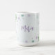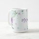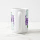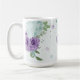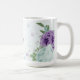 flores azuis roxas românticas com algumas folhas verdes caneca de café botânica.